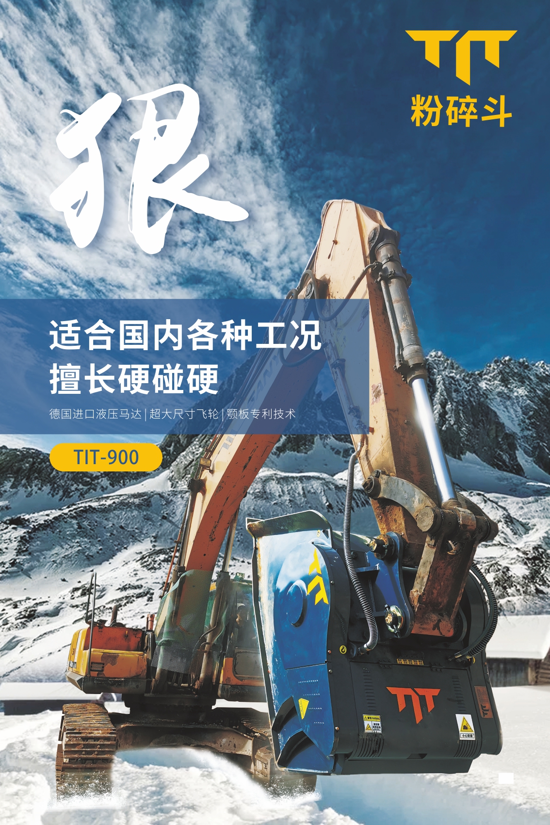 TIT,源自Titan的縮寫,原指古希臘神話中力大無(wú)窮的威猛之神,借意本產(chǎn)品剛勁有力,產(chǎn)能高效。TIT粉碎斗,也稱破碎斗,顎式破碎斗,是一款創(chuàng)新型挖掘機(jī)屬具,掛于挖掘機(jī)大臂上,可快速將工程惰性材料破碎成極具價(jià)值的工程用料。隨著國(guó)內(nèi)基建行業(yè)展,基于市場(chǎng)對(duì)經(jīng)濟(jì)化、效率化、環(huán)保化材料的大量需求,破碎斗將廣泛應(yīng)用于多種物料破碎場(chǎng)景。 |